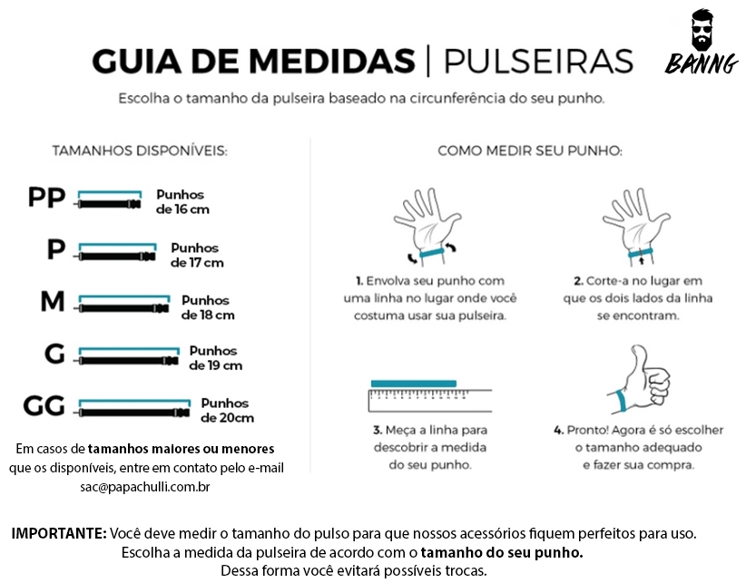 Há cinco tamanhos disponíveis do Combo Masculino de Pulseiras Aaron Logo abaixo o guia de medidas vai te auxiliar a como medir seu pulso para escolher seu tamanho ideal!